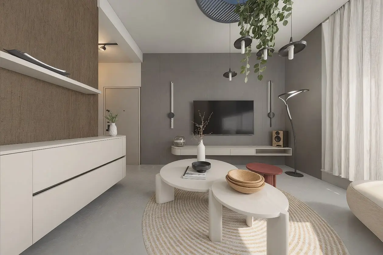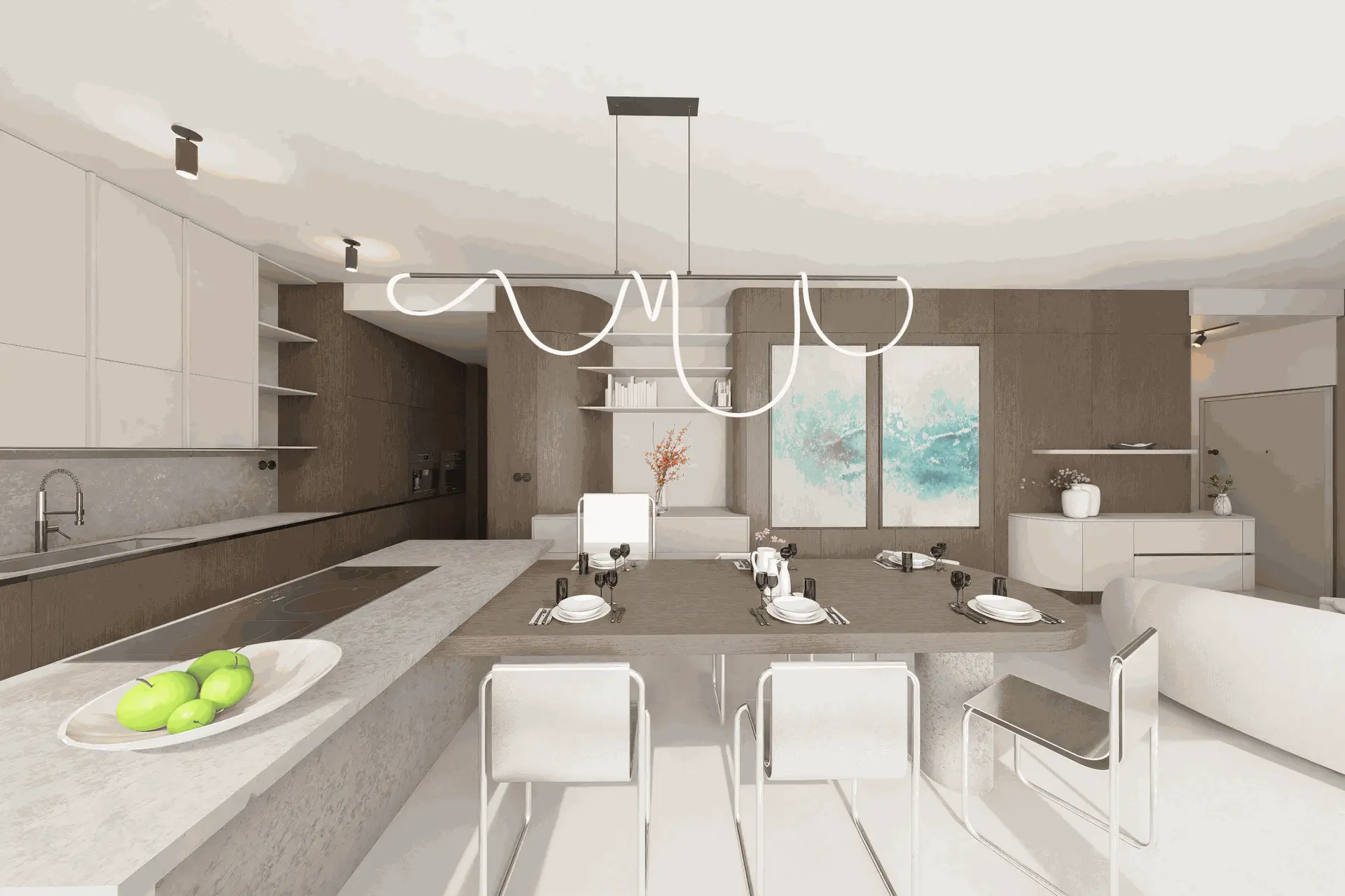 Byt je riešený s dôrazom na otvorenosť a plynulosť jednotlivých zón. Svetlé tóny v kombinácii s doplnkami vytvárajú pocit vzdušnosti a útulnosti. Každá miestnosť má svoj vlastný charakter, no zároveň spolu všetky časti tvoria jednotný celok.
