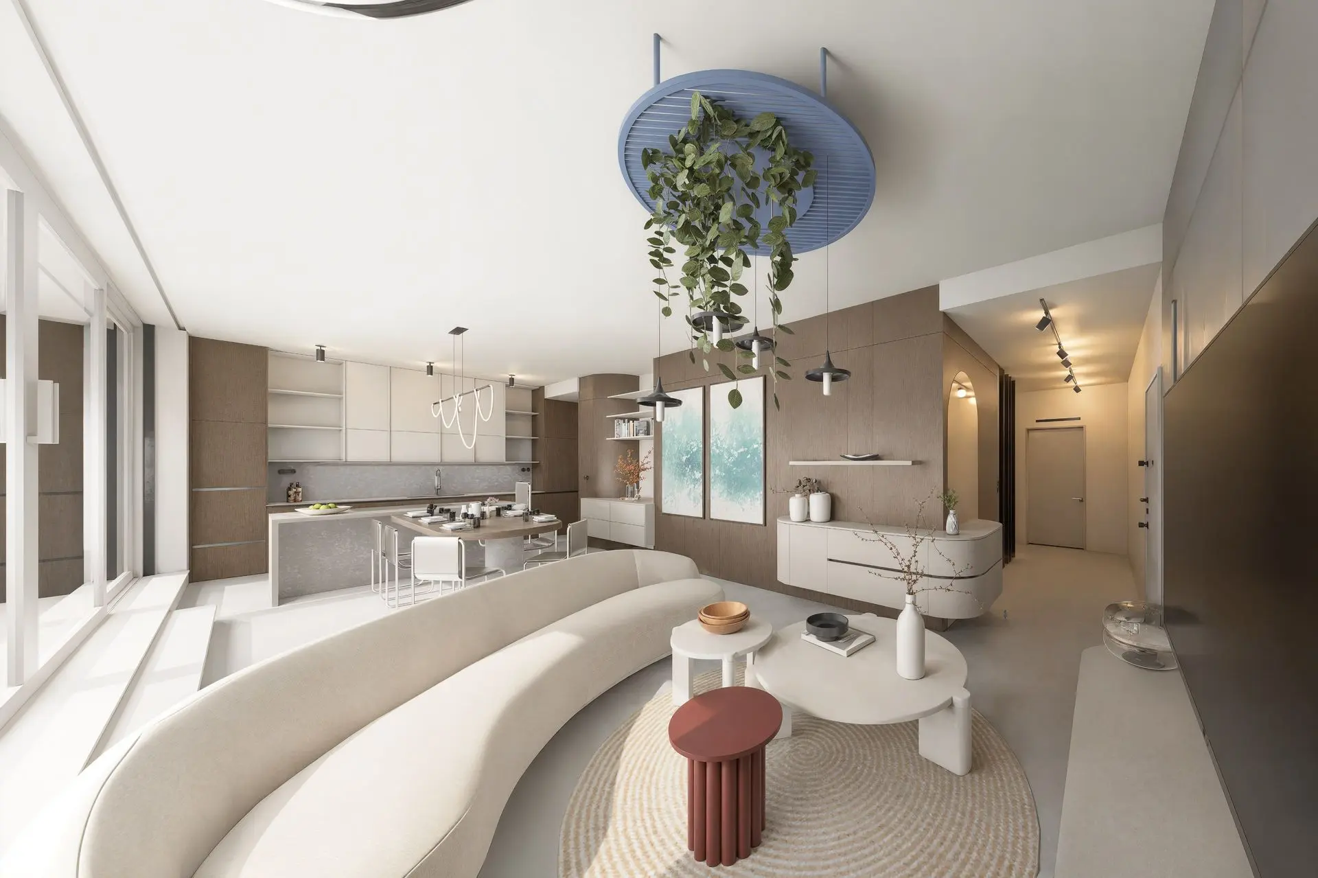 Byt je riešený s dôrazom na otvorenosť a plynulosť jednotlivých zón. Svetlé tóny v kombinácii s doplnkami vytvárajú pocit vzdušnosti a útulnosti. Každá miestnosť má svoj vlastný charakter, no zároveň spolu všetky časti tvoria jednotný celok.